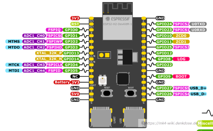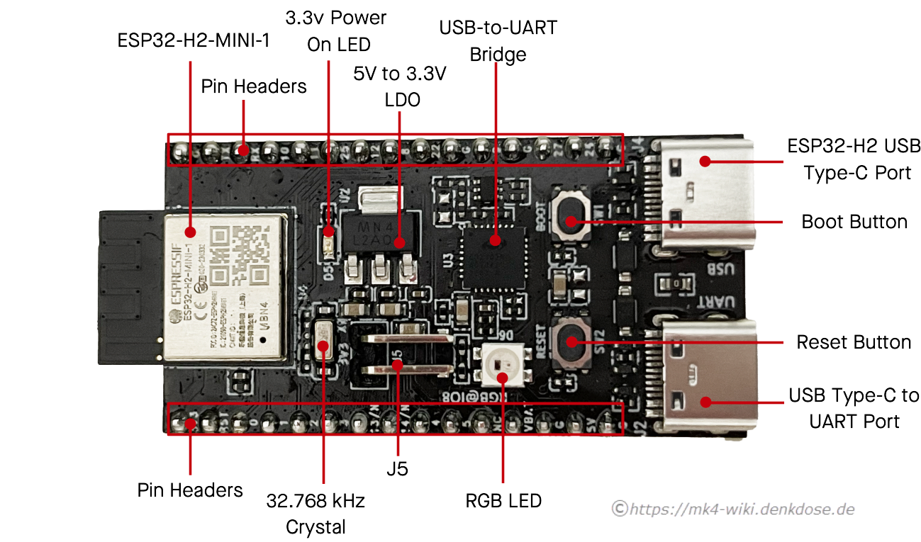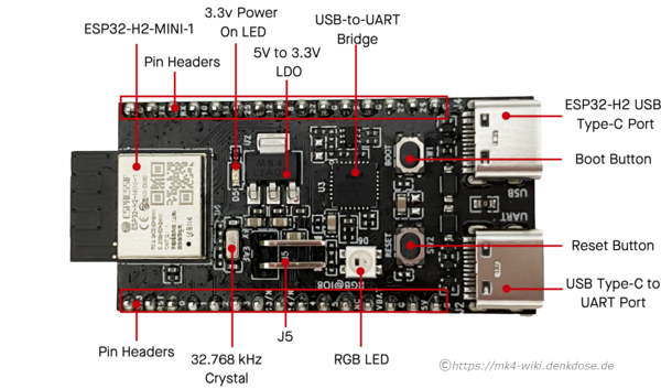 Dieses Development-Board (original von „espressif“, aber auch gern vom China-Mann gecloned) beinhaltet das „ESP32-H2-MINI-1“ Basis-Modul: