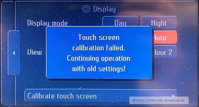 Warum die Kalibration fehl schlug erfährt man leider nicht. Möglicherweise hat man falsch gedrückt, oder aber der Touch-Digitizer hat einen Defekt und die von ihm gemeldeten Positionswerte erscheinen der Firmware unplausibel. In jedem Fall sollte man die Kalibration mehrmals wiederholen bevor man sich an eine Reparatur macht.
