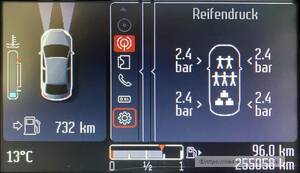 Das System kann nur Druckwerte bis 3,3 Bar messen. Beträgt der Reifendruck 3,3 Bar oder mehr, wird unter dem Druckwert ein + angezeigt, welches darauf hinweist, dass der Reifendruck möglicherweise darüber liegt. Der Reifendruck kann aufgrund von atmosphärischen Druckänderungen (gering) aber vor allem durch die Innentemperatur des Reifens aufgrund hoher Geschwindigkeit oder Zuladen (stärker) von dem ursprünglichen Befülldruck im Stand abweichen.