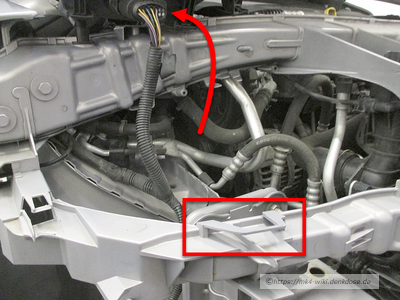 Auf der Beifahrerseite den Kabelbaumstecker von der Kupplung trennen (liegt direkt unterhalb vom Scheinwerfer) und den Kabelhalter aushebeln