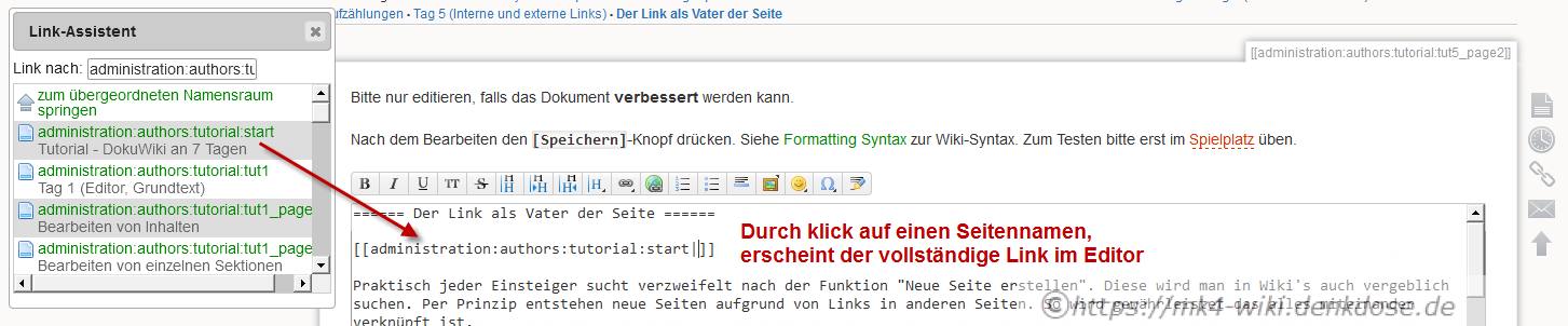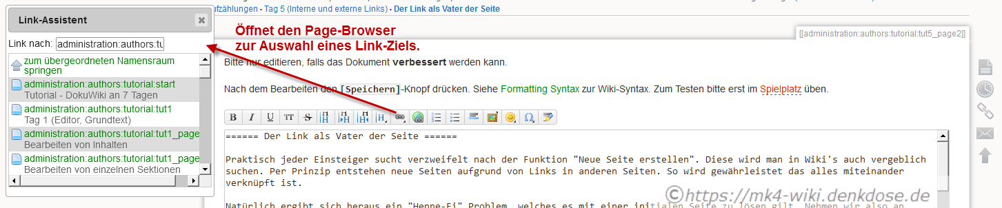 In diesem werden die Seiten des aktuellen Namespaces angezeigt und können per Klick einfach direkt als Link an der aktuellen Cursorposition im Editor eingebettet werden: