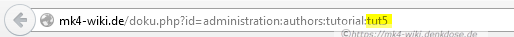 Hinter dem Fragezeichen im statischen Teil der URL befindet sich der ID-Paramter (http://mk4-wiki.de/doku.php?id=...). Diesem folgt der Wikipfad zur aktuell dargestellten Seite. Die Elemente des Pfades sind durch Doppelpunkt (:) getrennt. Das letzte Element ist der Seitenname (im Beispiel „tut5“).
